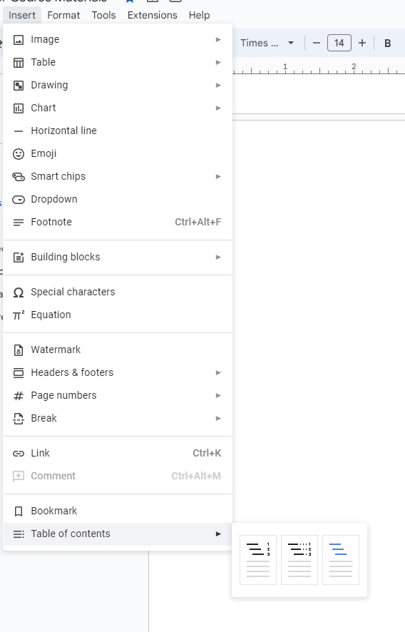 In the Google Doc, select Insert > Table of Contents