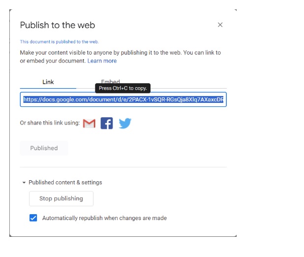 In the Google Doc, select File > Share > Publish to web