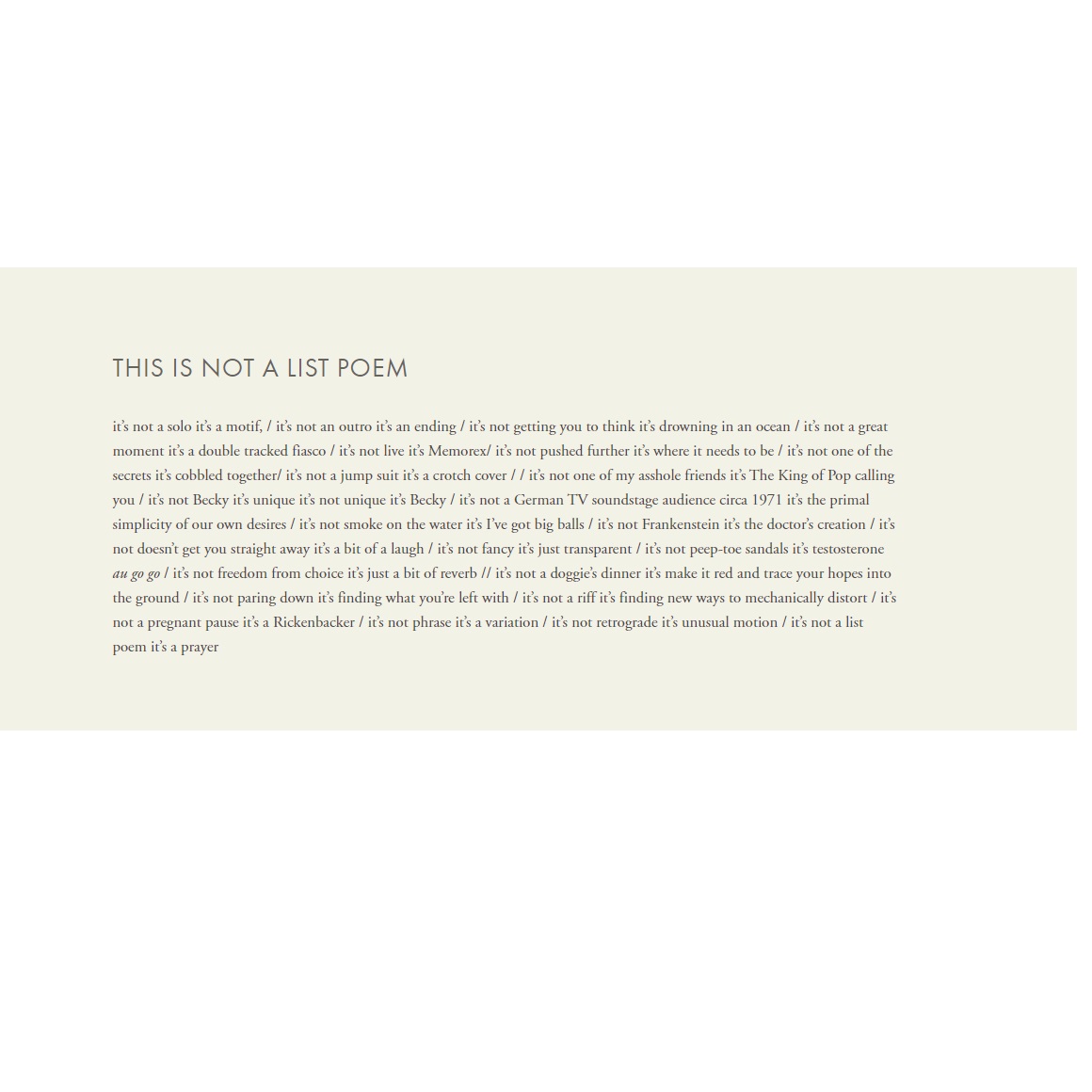 “[I can’t even say punk was important, even as it happened,]”; “Hello, Dolly”; “On the Meeting of Frank O’Hara and David Lee Roth”; “Debate Outside Four-Faced Liar, 2003”; “This Is Not a List Poem,” Court Green.